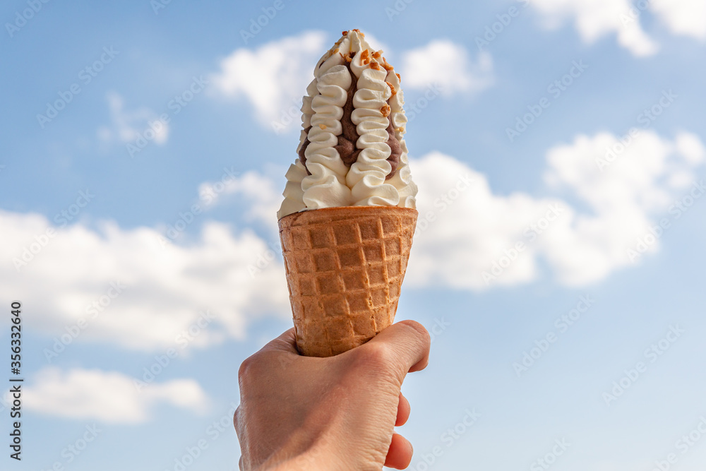 Big tasty yummy and beautiful ice cream with nuts and crunchy cone Very well made.