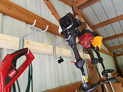 HANGTHIS Up Weed Wacker Organizer hangs from ceiling rafters in Very well made.