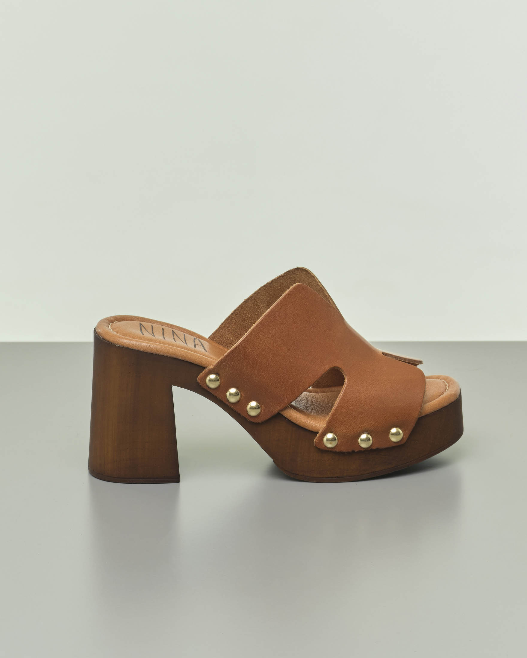 Sabot in pelle color cuoio con cut out sulla fascia frontale tacco alto e plateu Very well made.